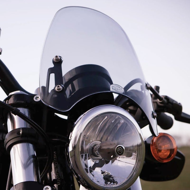 スポーツスター フォーティ―エイト用 フライスクリーンです。 フロントフォークに装着します。ハンドルマウント式でないため、ハンドル形状に左右されません。 2015以前の39mm径フロントフォーク車用。 形状は先端に向けてテーパーする、すっきりとしたデザイン。 材質は丈夫な厚さ4mmのポリカーボネイト。 衝撃に強い自動車部品グレード。 傷防止のハードコート処理済みです。 ブラケットはスチール製。レーザーカットとCNCマシン曲げで製作されています。フィニッシュはテクスチャーブラック。 スクリーンとブラケットの接合部はエチレンプロピレンゴム製の防振グロメットを使用しています。 フォーククランプはグラスファイバー繊維入りの強化プラスチック素材。柔軟性に富んだエラストマー樹脂製のコレットと合わせ、しっかりとクランプ出来ます ※商品細部は予告なしに変更されることがあります。あらかじめご了承ください