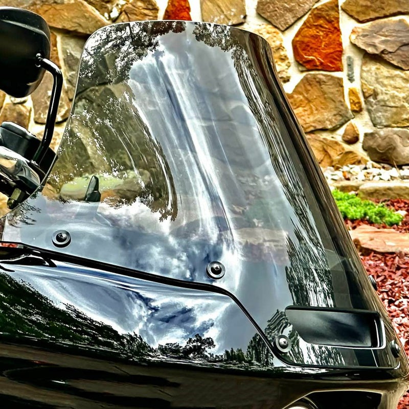 ローライダーST、エルディアブロ用 ウィンドシールドです。 クルージングでの静粛性が向上し、ライダーへの風圧や乱流を防ぐため、長時間走行での疲労が圧倒的に軽減します。 ノーマルシールドよりも1.5インチ(約3.8cm)幅広で、防風効果が高まり、高速走行時の静粛性が向上します。 また、トップ部分にカーブがついており、走行風を上方に流します。 フェアリングに合わせたベント付き。走行風をスクリーン内側に流すことで乱流の発生を防ぎ、走行風全体を整流し上方へと流します。 高さは12.25インチ(約31cm)。ノーマルよりも3.5インチ(約9cm)高くなります。 ※アメリカ コロラド州のClearview Shields(クリアビューシールド)は、1986年の創業以来ハーレーをはじめとするモーターサイクル用ウィンドシールドを作り続けており、熟練した職人の手作業による高品質な製品はマーケットで高い評価を得ています。