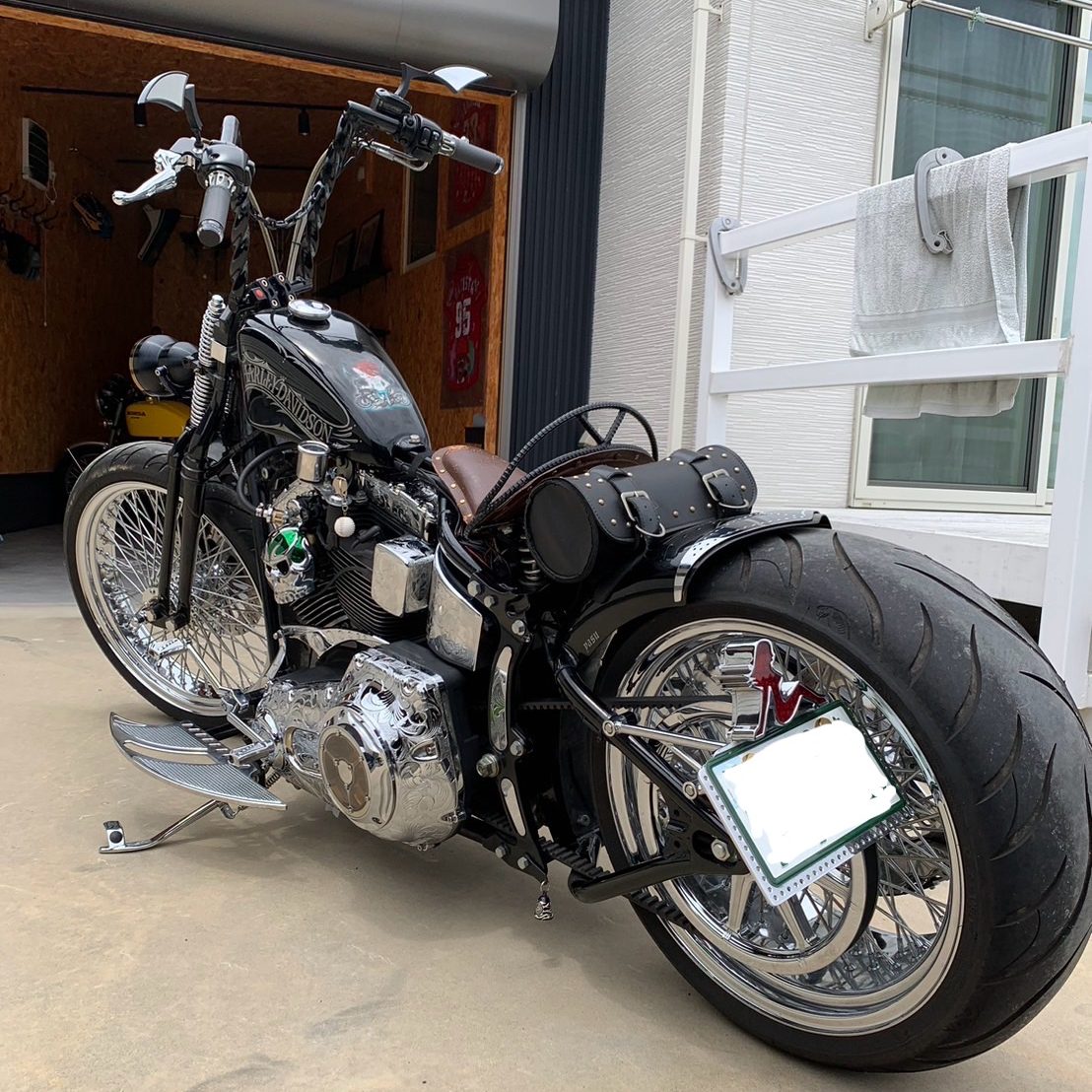 各所に施された彫金やワンオフのマフラー、ハンドル、PMのキャリパーやアレンネスのエアクリーナー、さらにポールヤフィーやJH CHOPPERSなどのエッジの効いたカスタムパーツが複雑に美しくまとまったカスタムハーレーです。シートの鉄筋を用いたカスタムワークは非常に勉強になりました。